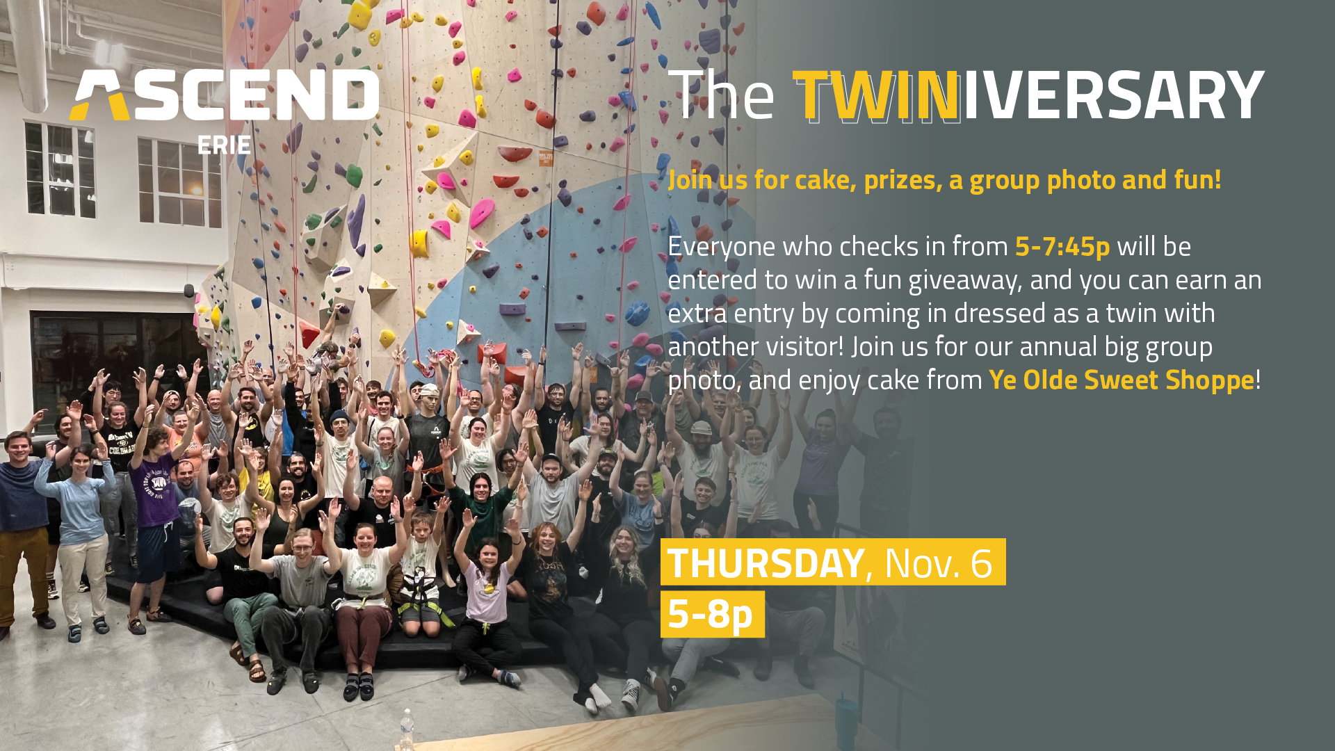 Common values and vision have evolved into this collaboration between ClimbERIE and ASCEND and ASCEND Erie will be the product. Our focus is on creating a community. Not just of climbers, but all residents of the Erie area. ASCEND Erie will be a place that this great city will be proud of, as a business, as a landmark, and as a champion for the city itself. Our name may not be ClimbERIE, but the values and dedication to the community remain. That spirit that has encouraged and motivated us through the last three years will always remain at the heart of ASCEND Erie and we look forward to serving you for years to come. Thank you!