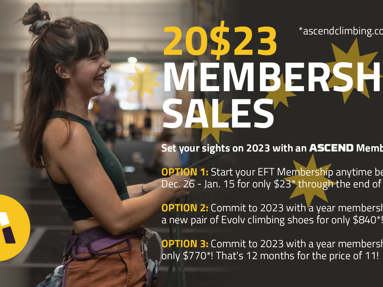 Option 2: Commit to 2023 with a year membership and a new pair of Evolv climbing shoes for only $840*! Purchasers of this membership get $99 to spend toward any Evolv climbing shoe. That means that Defy or Elektras are FREE and all other models are $99 less than retail pricing! Sale runs from December 26 - January 15. Purchasers will get an email with instructions to complete an order form sometime between 1/1-1/16. The shoes are expected to arrive in late January. This membership starts on 1/1/23 and ends on 12/31/23. Placing it on hold is not permitted. This membership is non-refundable and non-transferable. Purchasers who currently hold an active EFT membership will have their next monthly billing date moved from Jan. 1, 2023 to Jan. 1, 2024.