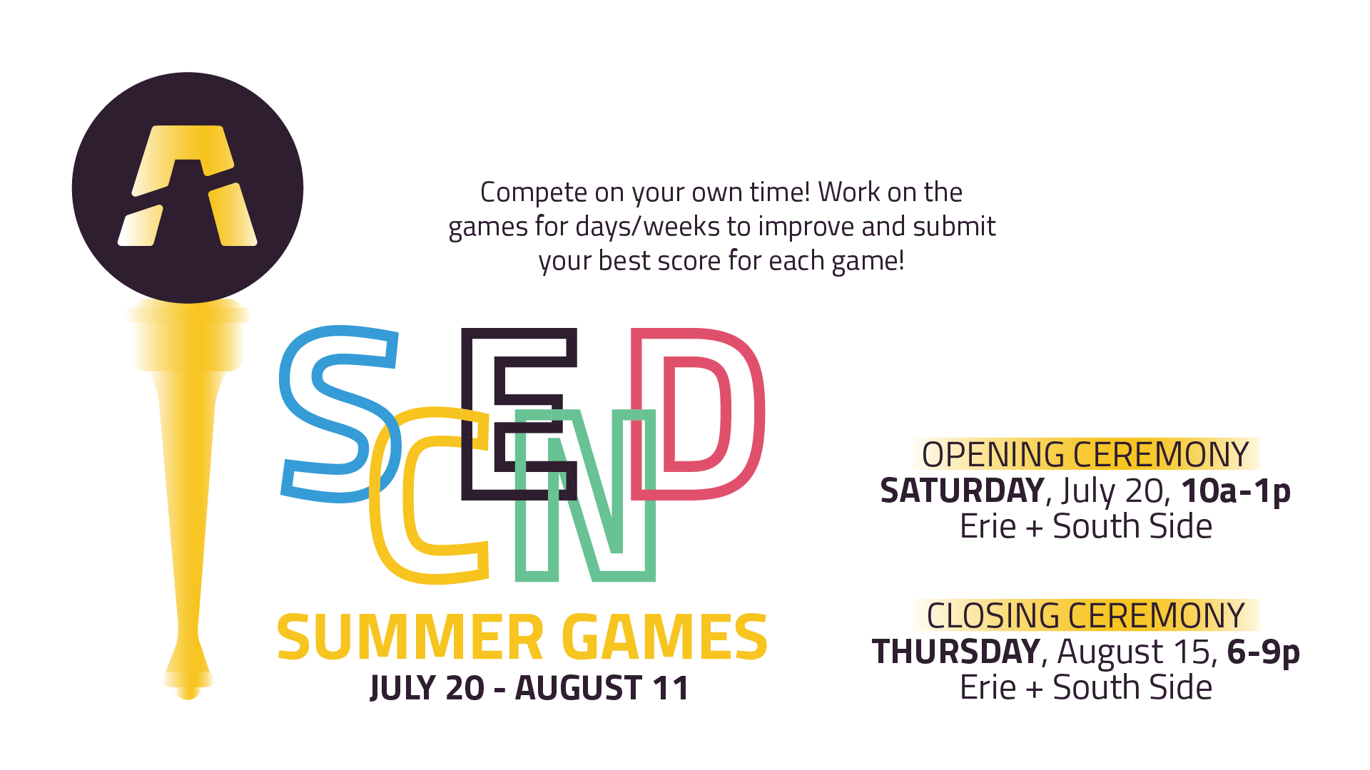 We'll close the ASCEND Summer Games out on Thursday, August 15 from 6-8p at ASCEND South Side and Erie. More details to come, but you can expect winners and prizes to be announced and awarded, along with some other fun activities to make the most of the night together.