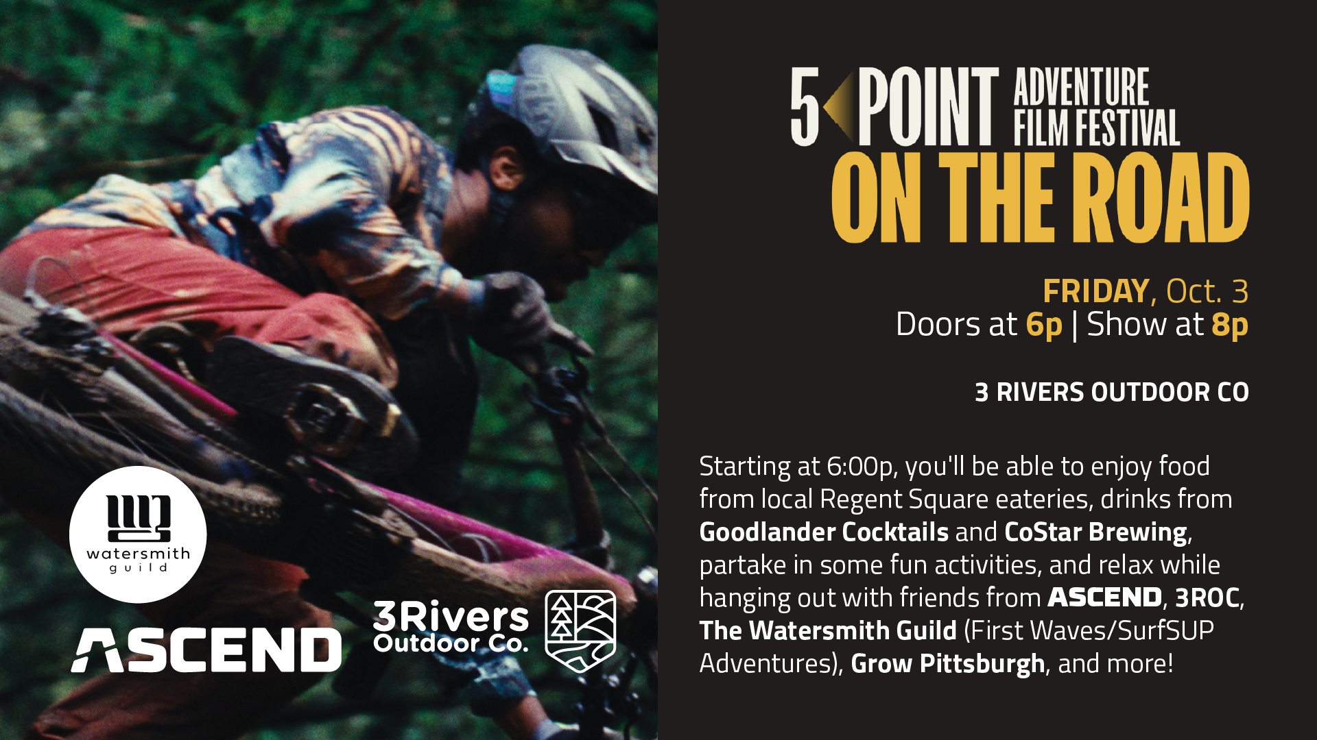 Get outside to watch some outdoor films! Come party with ASCEND, 3 Rivers Outdoor Company, and The Watersmith Guild (First Waves/SurfSUP Adventures) on Friday, October 3 for Pittsburgh's 7th Annual 5Point Film Festival!
