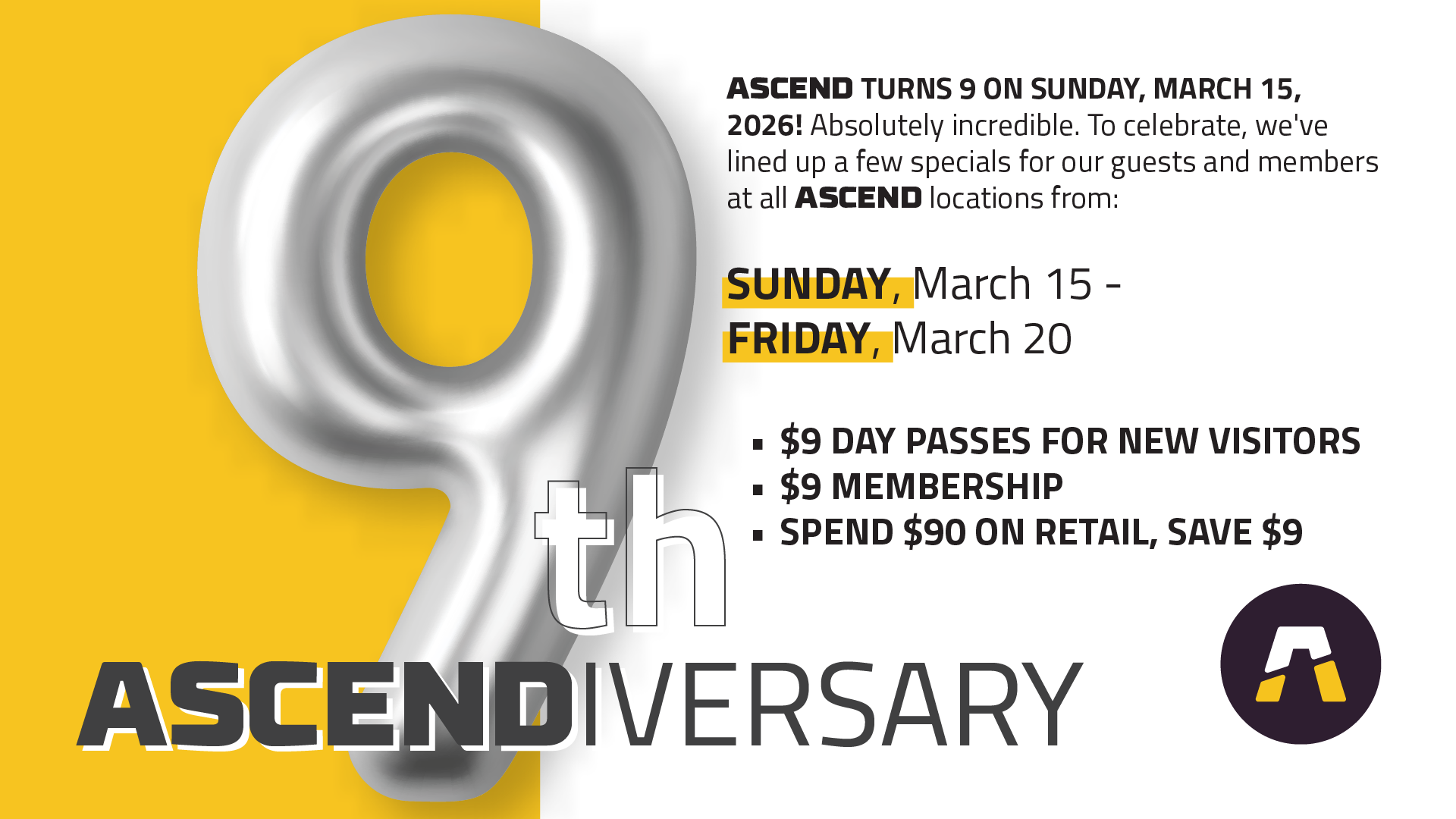 ASCEND turns 9 on Sunday, March 15, 2026! Absolutely incredible. To celebrate, we've lined up a few specials for our guests and members at all ASCEND locations from Sunday 3/15 - Friday 3/20.