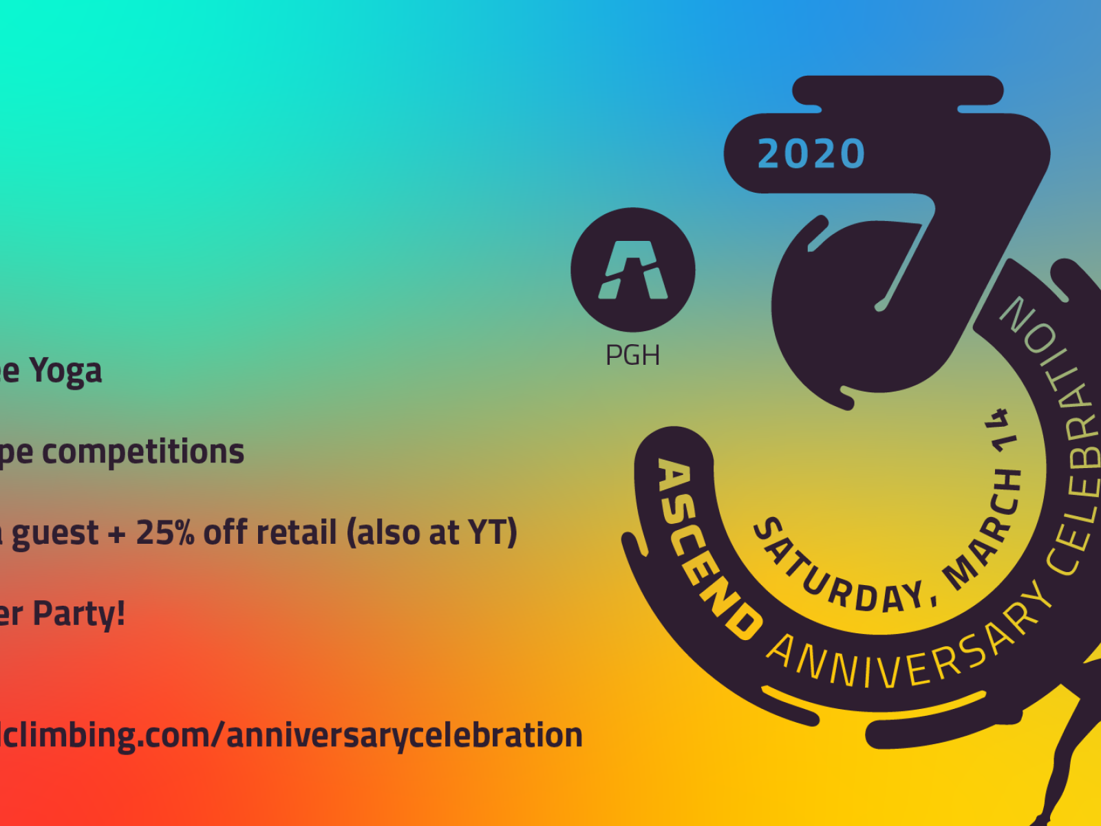 On Saturday, March 14, join us for a jam-packed day of fun while ASCEND Pittsburgh celebrates its 3rd Anniversary! The majority of the activities are occuring at ASCEND Pittsburgh, but ASCEND Youngstown climbers can still enjoy the member perks and headlamp climbing from 9p-10p. We've got a little something for everyone, so read up below and choose your own adventure.