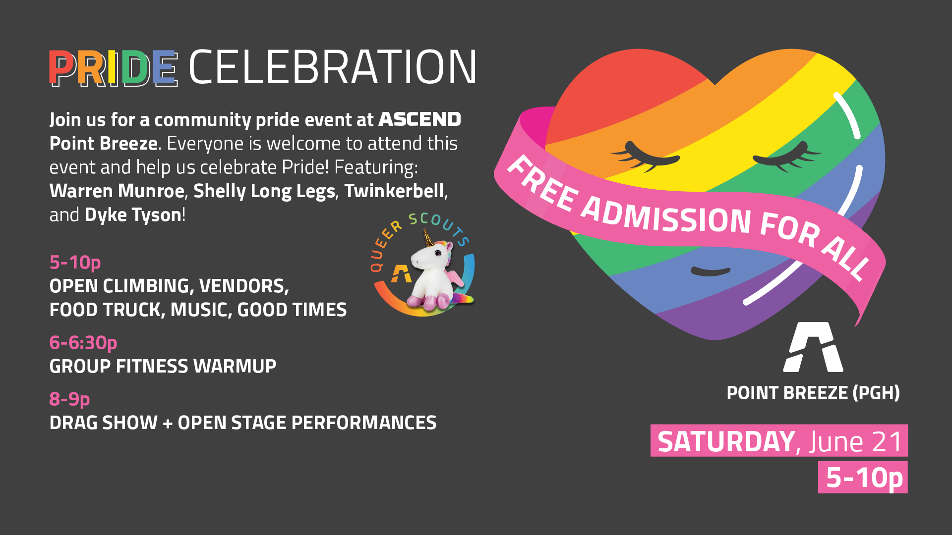 In partnership with ASCEND's Queer Scouts, join us for a community pride event at ASCEND Point Breeze. Everyone is welcome to attend this event and help us celebrate Pride! Climbing isn't required to attend, and beginners are encouraged to join us! Our friendly staff will be on hand and ready to get you on the walls.