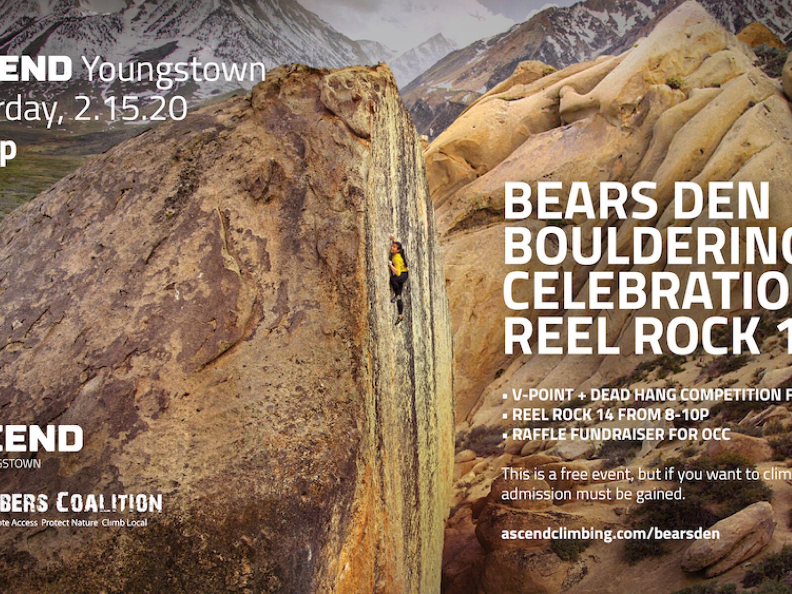 Join the Youngstown, OH climbing community and celebrate the opening of Bears Den, a bouldering area conveniently located in Mill Creek Park. The Ohio Climbers Coalition (OCC) will be providing resources and education about Bears Den and other regional climbing areas, as well as hosting a raffle, seeking memberships, and giving away some sweet swag! There are no additional fees to compete, but you either need to be an ASCEND member or purchase a day pass. Climbing will not be permitted past 8p, once the film starts.