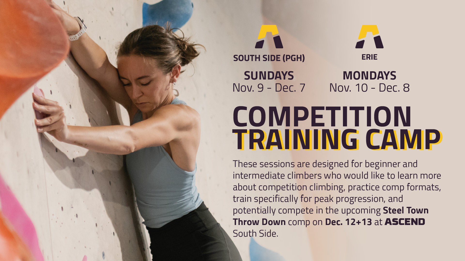 These sessions are designed for beginner and intermediate climbers who would like to learn more about competition climbing, practice comp formats, train specifically for peak progression, and potentially compete in the upcoming Steel Town Throw Down comp on Dec. 12th + 13th at ASCEND South Side.