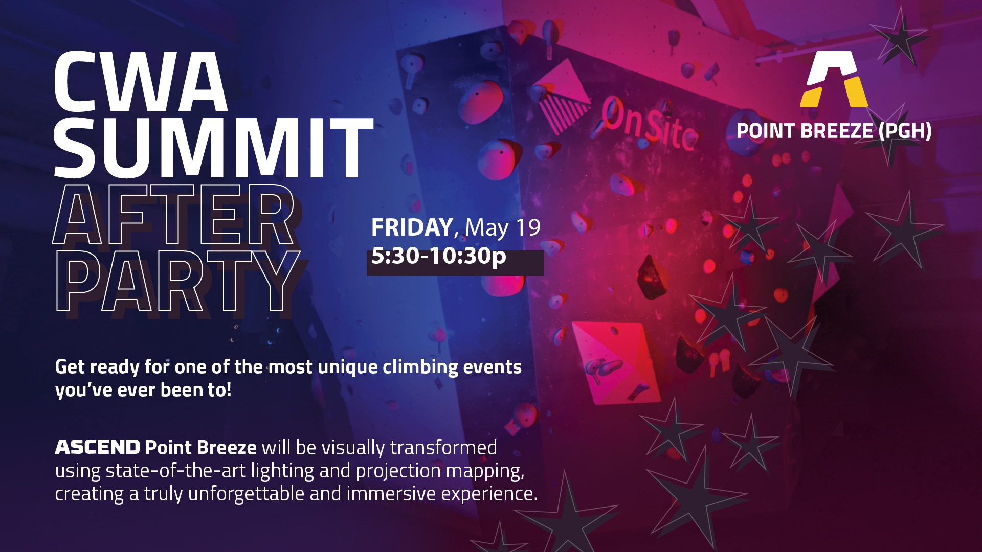Get ready for one of the most unique climbing events you’ve ever been to! ASCEND Point Breeze will be visually transformed using state-of-the-art lighting and projection mapping, creating a truly unforgettable and immersive experience. Whether you’re climbing, or just enjoying a drink in good company, it’ll be the perfect capstone to an epic week at the CWA Summit. We really hope you can make it!