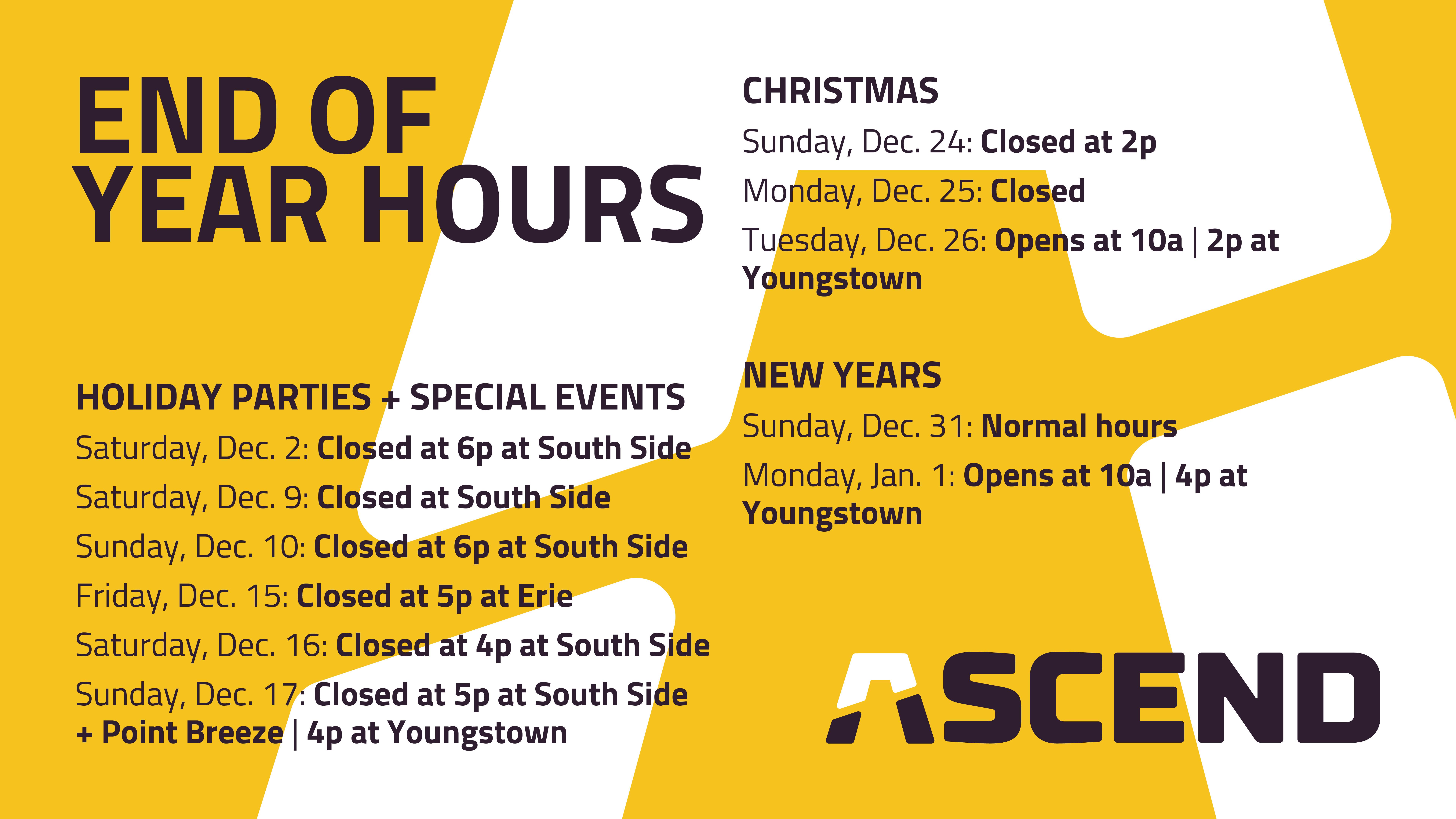 Sunday, December 17: Closed at 5p at South Side + Point Breeze | 4p at Youngstown (Company Party)