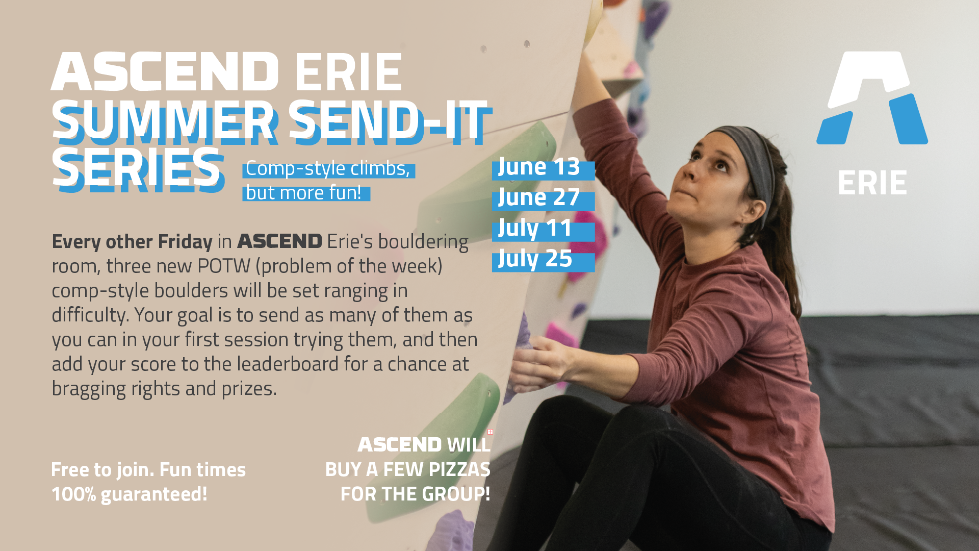 Every other Friday in ASCEND Erie's bouldering room, three new POTW (problem of the week) comp-style boulders will be set ranging in difficulty. Your goal is to send as many of them as you can in your first session trying them and then add you score to the leaderboard.