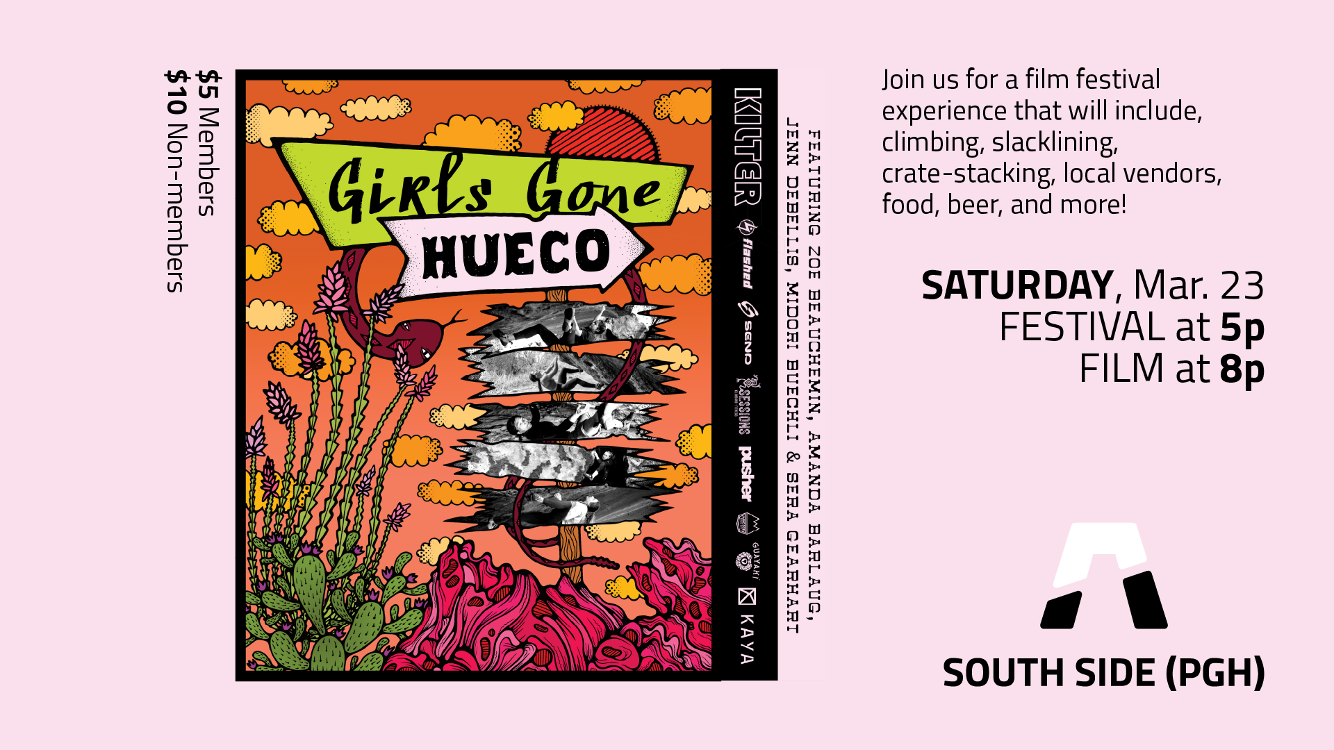 Join us for a film festival experience that will include, climbing, slacklining, crate-stacking, local vendors, food, beer, and more! Once we've had our fun, we'll relax and enjoy the show!