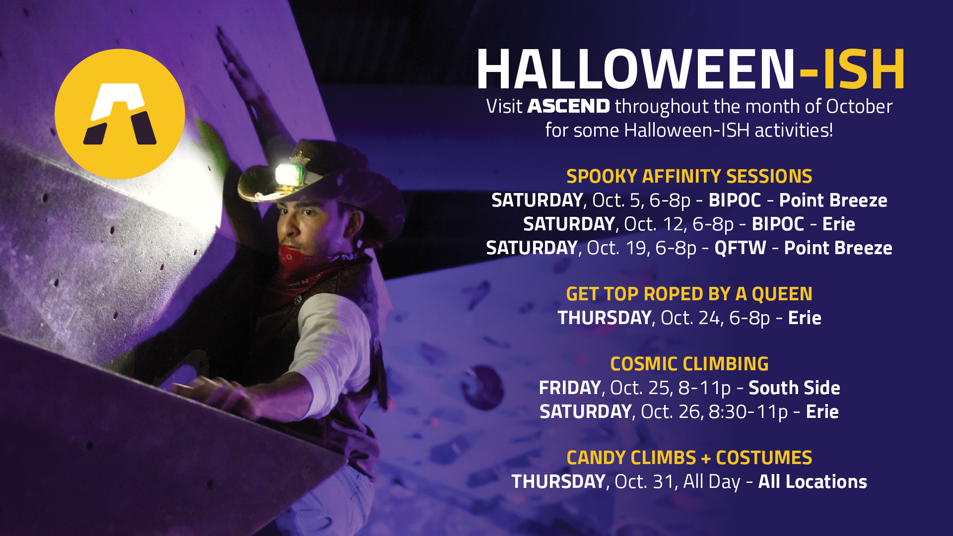 Visit ASCEND throughout the month of October for some Halloween-ISH activities! Costumes are encouraged, but not required. Please refrain from wearing a costume which includes paint, glitter, or sharp objects which could all damage the climbing pads or yourself. Thank you!