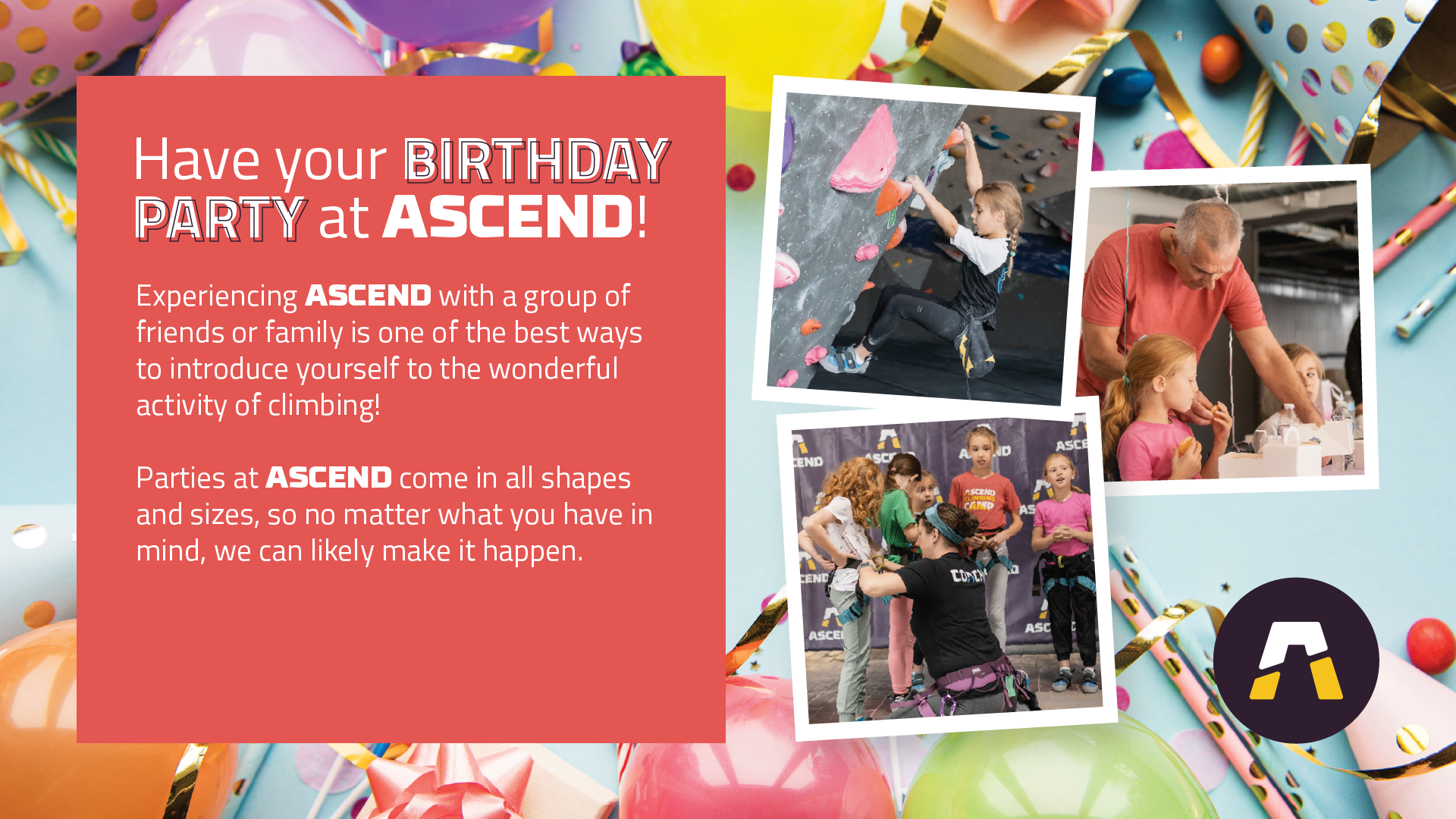 Experiencing ASCEND with a group of friends or family is one of the best ways to introduce yourself to the wonderful activity of climbing! Parties and groups at ASCEND come in all shapes and sizes, so no matter what you have in mind, we can likely make it happen.