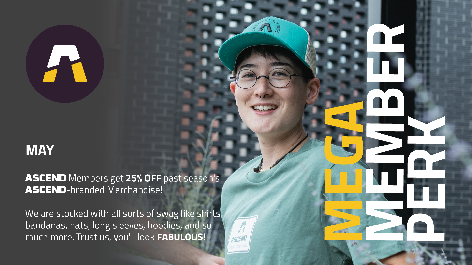 ASCEND Members get 25% off past season's ASCEND-branded Merchandise! We are stocked with all sorts of swag like shirts, bandanas, hats, long sleeves, hoodies, and so much more. Trust us, you'll look FABULOUS!