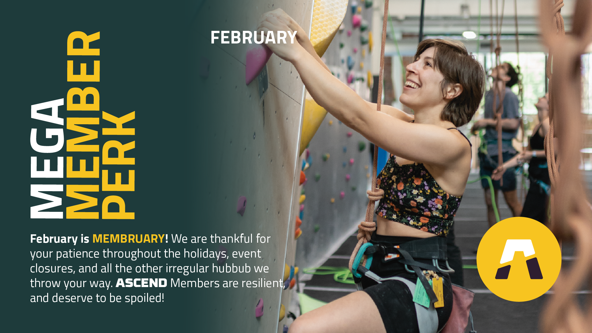 February is MEMBRUARY! We are thankful for your patience throughout the holidays, event closures, and all the other irregular hubbub we throw your way. ASCEND Members are resilient, but that doesn't mean you don't deserve to be spoiled!