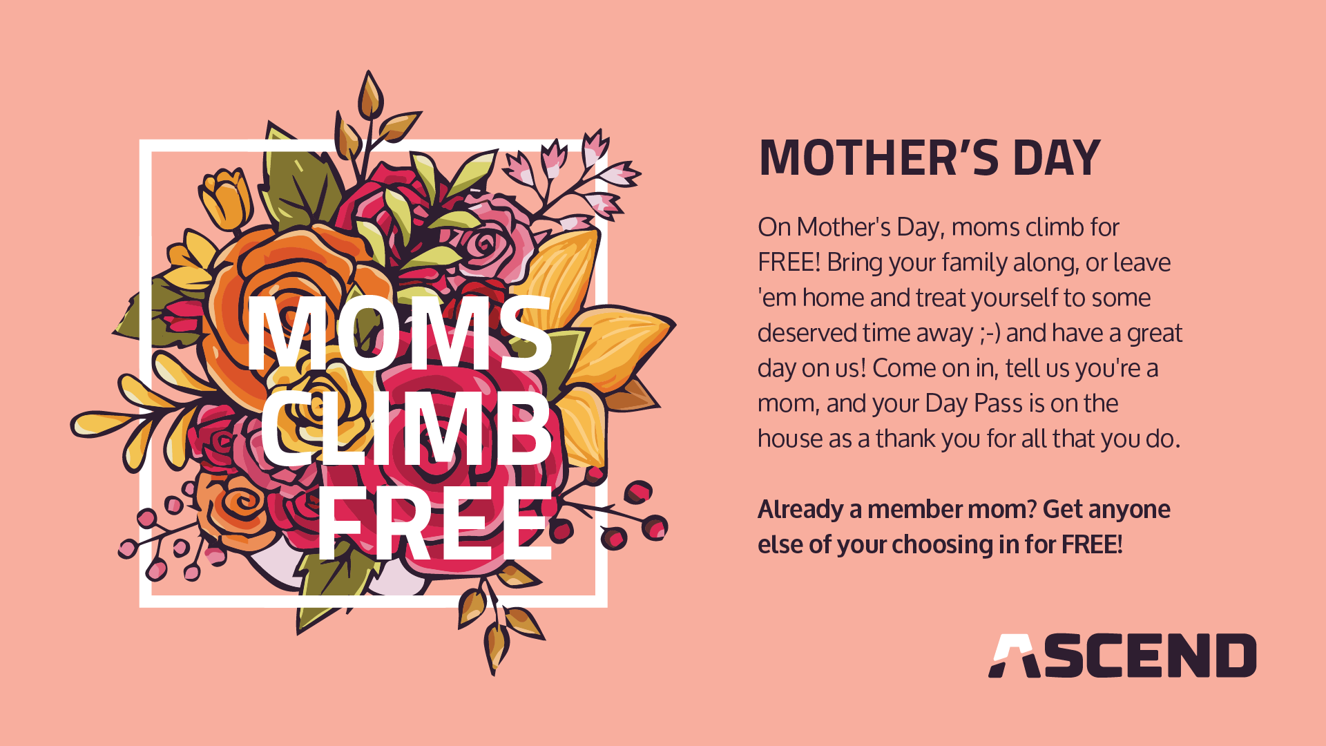 Spend this lovely weekend at ASCEND to celebrate Mother's Day! Offers valid Friday 5/9 - Monday 5/12 at all ASCEND locations.