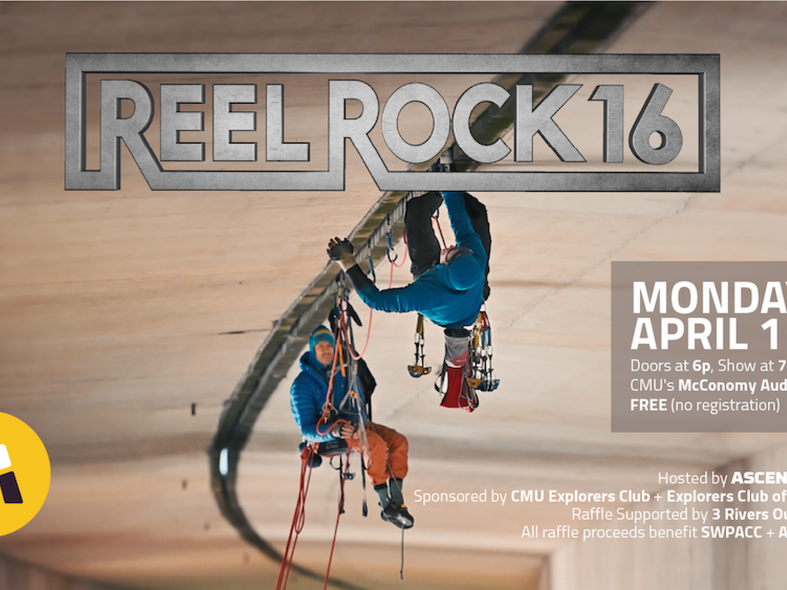 Bridge Boys: A horizontal big-wall adventure on the longest, most ridiculous crack climb ever attempted. Featuring: Pete Whittaker, Tom Randall (30 min.)Barefoot Charles: Meet the opera-singing, cave-dwelling Frenchman who climbs futuristic boulder problems sans chaussons. Featuring: Charles Albert (30 min.)Big Things To Come: An elite boulderer’s struggle with a project propels her on a decade-long journey of self-discovery. Featuring: Alex Johnson (20 min.)Cuddle: A massive link-up of 17 alpine summits pushes a famed climbing duo to the brink - and into each others' arms. Featuring: Alex Honnold, Tommy Caldwell, Adam Stack (35 min.)Location: CMU McConomy AuditoriumParking: Morewood parking lot (across Forbes, entrance on Morewood) is free in the evening after 5 for visitors. The East Campus Parking garage is no longer free for visitors, which is a change from previous years.COVID Precautions: At this time, CMU is stating that:masks are required for anyone who is not up to date on vaccinations (including boosters), but not required for those who arefood and drinks are not allowedDate: Monday, April 11, 2022Time: Doors and raffle sale at 6p | Film at 7pClosed Captions: Yes! This film will be presented with closed captions.Price: FREE - no tickets required (Thanks to CMUX and ECP!)Raffle: Like past years, raffle tickets can be purchased for a chance to win 10 AWESOME prize packages. 100% of proceeds benefit SWPACC + Access Fund. Cash and credit accepted!Prize Package Donors: Petzl, Black Diamond, Cotopaxi, Friction Labs, Organic, ClimbOn, Chalk Cartel, Metolius, Butora, Red Chili, Wild Country, ASCEND, 3ROC, and MORE!Raffle Organizers: ASCEND + 3 Rivers Outdoor Company$1 = 1 ticket$10 = 15 tickets$20 = 40 ticketsHUGE PROPS TO OUR EVENT SPONSORS