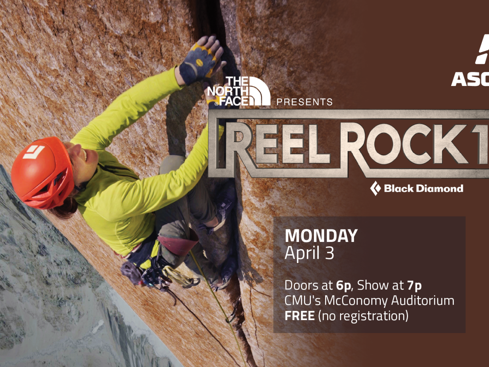 Location: CMU McConomy AuditoriumParking: Morewood parking lot (across Forbes, entrance on Morewood) is free in the evening after 5 for visitors. The East Campus Parking garage is no longer free for visitors, which is a change from previous years.Date: Monday, April 3, 2023Time: Doors and raffle sale at 6p | Film at 7pClosed Captions: Yes! This film will be presented with closed captions.Price: FREE - no tickets required (Thanks for co-sponsoring, CMUX + ECP!)Raffle: Like past years, raffle tickets can be purchased for a chance to win 10 AWESOME prize packages. 100% of proceeds benefit SWPACC + Access Fund. Cash and credit accepted!Prize Package Donors: TBARaffle Organizers: ASCEND + 3 Rivers Outdoor CompanyTickets will sell for: 3 for $5 | 10 for $10 | 30 for $20