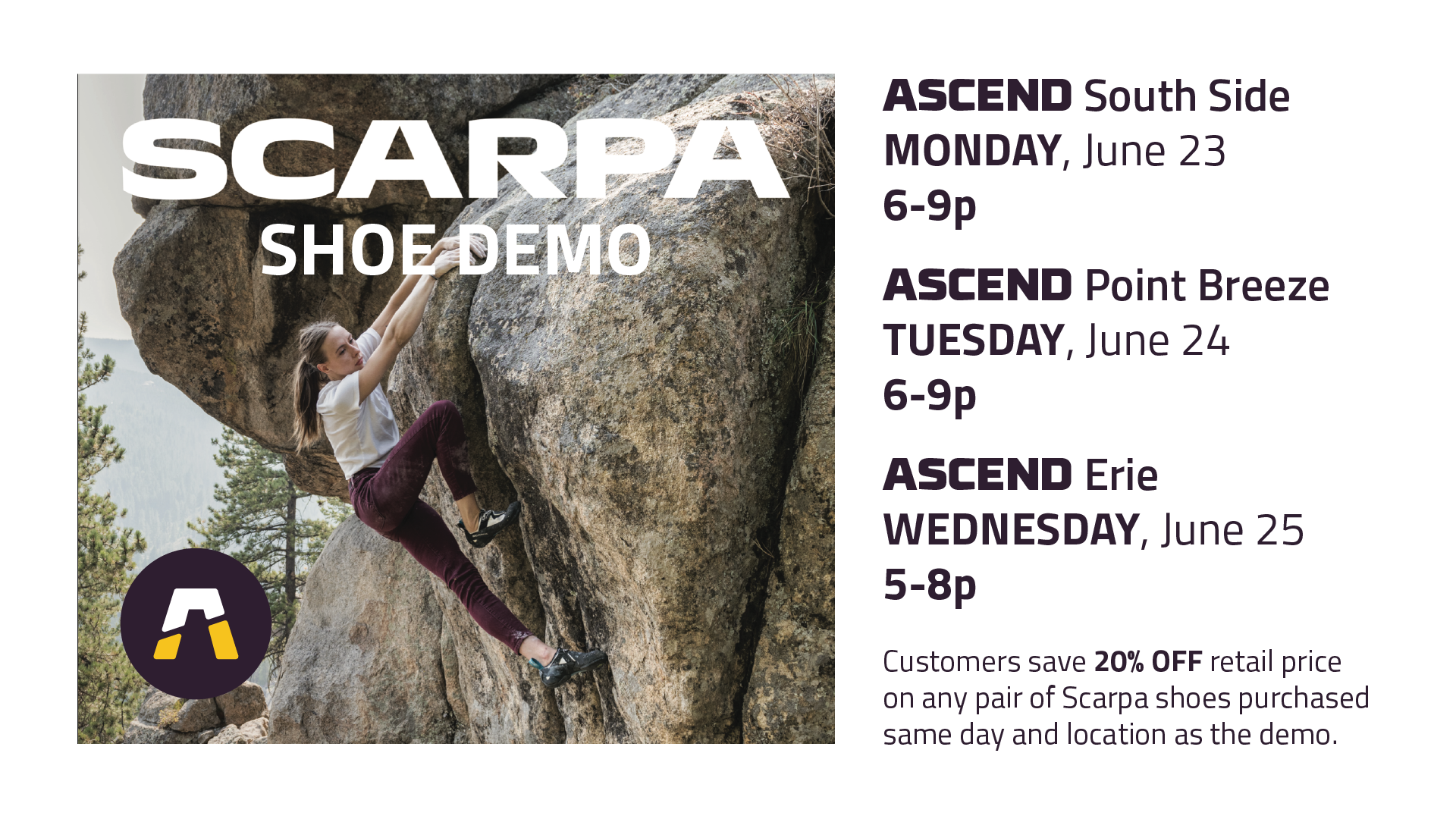 Our rep will be in with tons of shoes to try on. Customers save 20% OFF retail price on any pair of Scarpa shoes purchased same day and location as the demo. You don't have to be at the demo to save!