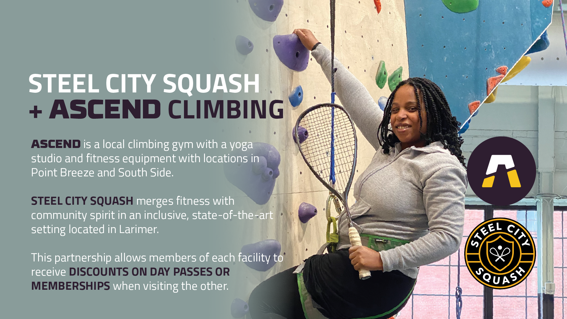 Active Members of Steel City Squash are eligible to be part of ASCEND Climbing's Discount Program! Simply show proof of your membership to our front desk staff team and get a discount on Day Pass purchases or a Monthly Renewing Membership.