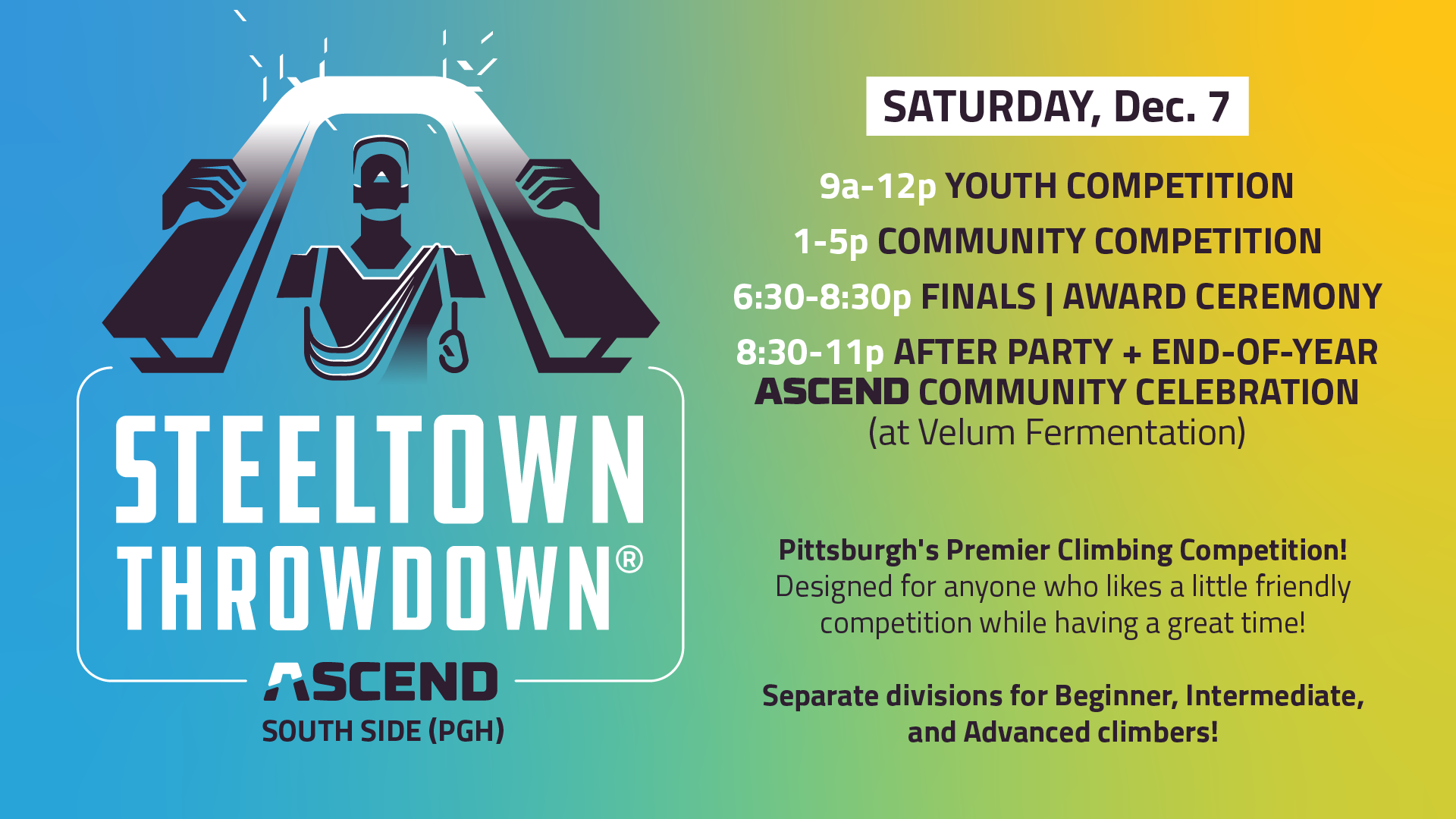 The ASCEND Steel Town Throw Down®, scheduled for Saturday, December 7, 2024, happening at ASCEND SOUTH SIDE, is Pittsburgh's premier climbing competition, designed for anyone who likes a little friendly competition while having a great time! We'll continue to add to this event post, so please check back often for the most up-to-date information.