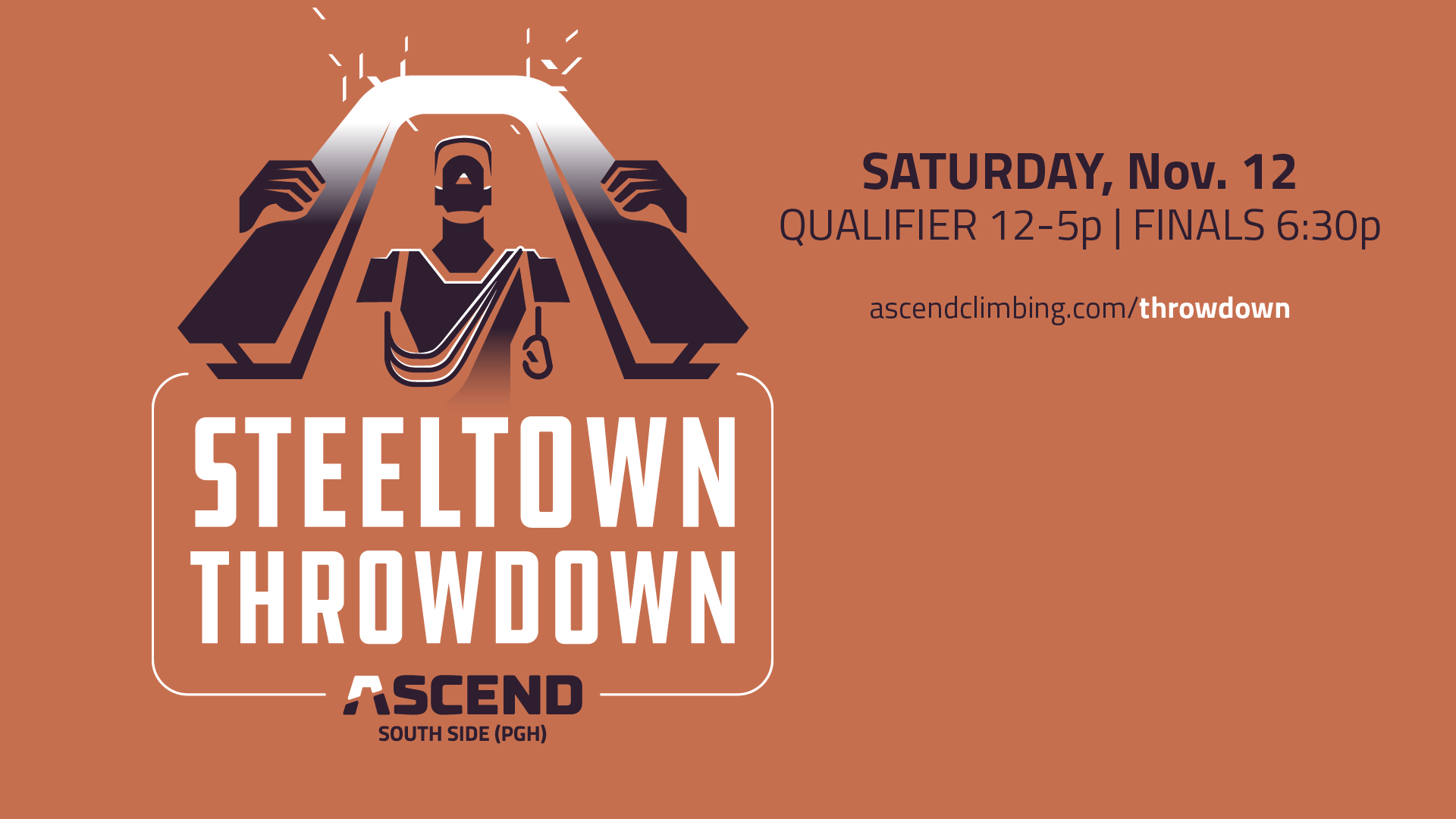 We haven't been able to host a Steel Town Throw Down to this scale since Fall 2019, so GET READY because we are going to BRING IT! The ASCEND Steel Town Throw Down, scheduled for Saturday, November 12, 2022, is Pittsburgh's premier climbing competition, designed for anyone who likes a little friendly competition while having a great time! We'll continue to add to this event post, so please check back often for the most up-to-date information.