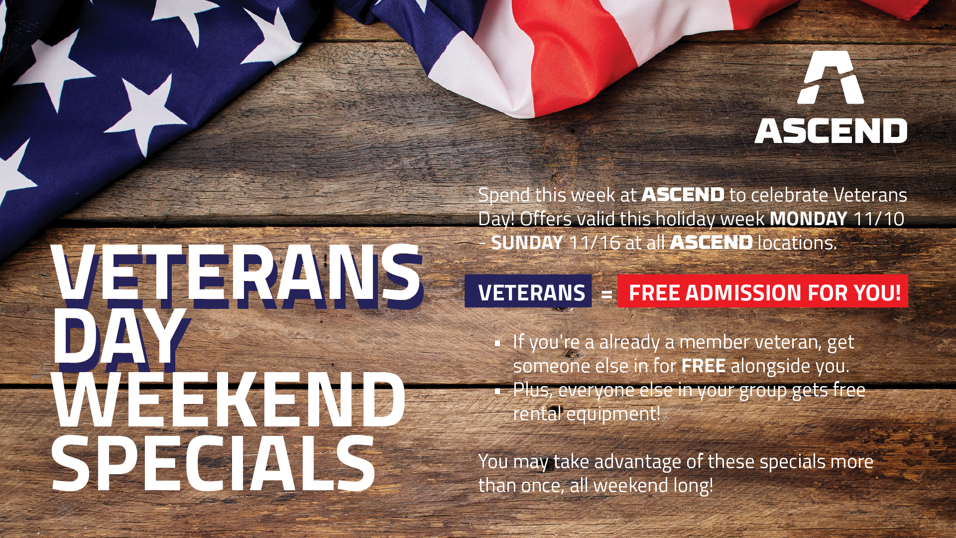 Spend this week at ASCEND to celebrate Veterans Day! Offers valid this holiday week Monday 11/10 - Sunday 11/16 at all ASCEND locations.