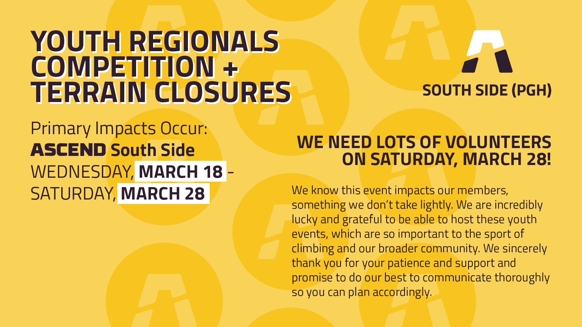 We know this event impacts our members, something we don’t take lightly. We are incredibly lucky and grateful to be able to host these youth events, which are so important to the sport of climbing and our broader community. We sincerely thank you for your patience and support and promise to do our best to communicate thoroughly so you can plan accordingly.