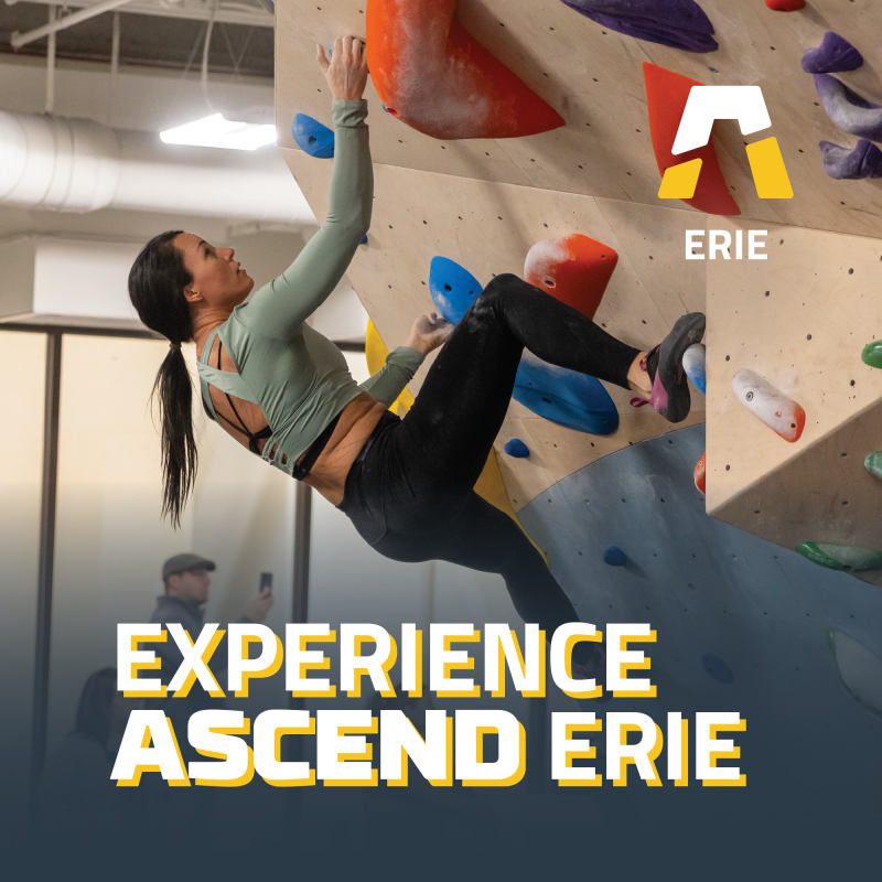 ASCEND Erie opened on November 3, 2023, bringing Erie residents this much desired sports and recreational amenity. This 25,000 SF facility, which is part of the Erie Downtown Development Corporation’s revitalization efforts, features 50’ lead climbing, top-roping, and auto-belay walls, ample bouldering terrain, a tranquil yoga room, an array of fitness equipment and climbing training tools, slacklines, a retail store featuring today's most trusted brands, your favorite concessions, modern restrooms with showers, changing areas, and gender neutral options, comfortable lounge space to relax, work, and socialize, and of course, tons of glass - natural light!