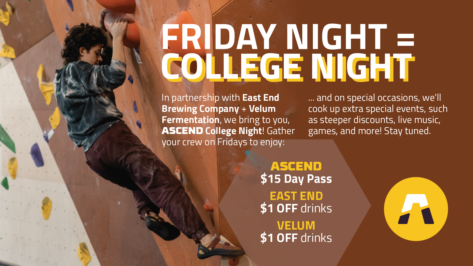 In partnership with East End Brewing Company + Velum Fermentation + ippa Pizza Napoletana, we bring to you, ASCEND College Night! Gather your crew on Fridays to enjoy:
